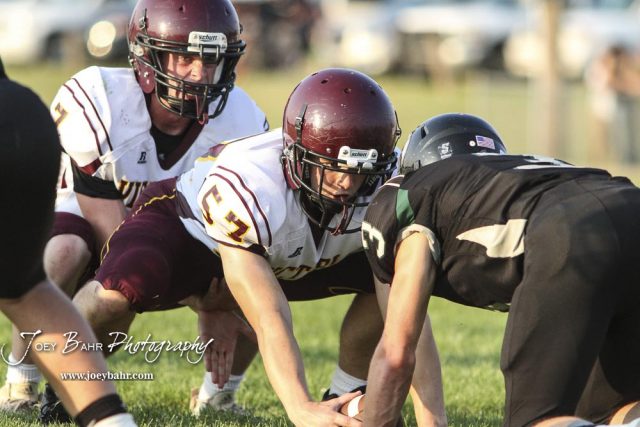 Victoria Knight #57 Wyatt Engel prepares to hike the ball to #7 Cooper Windholz in the third quarter. The Victoria Knights defeated the Central Plains Oilers by a score of 34 to 8 at Central Plains High School in Claflin, Kansas on September 2, 2017. (Photo: Joey Bahr, www.joeybahr.com)undefined