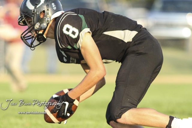 Central Plains Oiler #8 Anthony Oberle picks up a ball on a kickoff in the third quarter. The Victoria Knights defeated the Central Plains Oilers by a score of 34 to 8 at Central Plains High School in Claflin, Kansas on September 2, 2017. (Photo: Joey Bahr, www.joeybahr.com)undefined