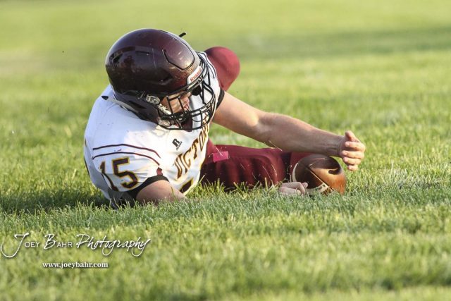Victoria Knight #15 Lucas Taylor covers up a fumbled ball in the third quarter. The Victoria Knights defeated the Central Plains Oilers by a score of 34 to 8 at Central Plains High School in Claflin, Kansas on September 2, 2017. (Photo: Joey Bahr, www.joeybahr.com)undefined