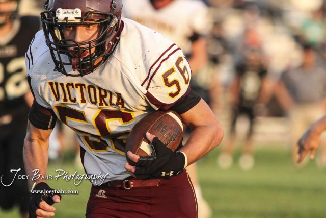Victoria Knight #56 Cooper Pfanenstiel rushes with the ball in the fourth quarter. The Victoria Knights defeated the Central Plains Oilers by a score of 34 to 8 at Central Plains High School in Claflin, Kansas on September 2, 2017. (Photo: Joey Bahr, www.joeybahr.com)undefined