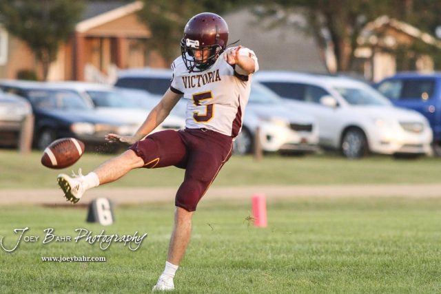 Victoria Knight #5 Collin Kisner punts the ball in the fourth quarter. The Victoria Knights defeated the Central Plains Oilers by a score of 34 to 8 at Central Plains High School in Claflin, Kansas on September 2, 2017. (Photo: Joey Bahr, www.joeybahr.com)undefined