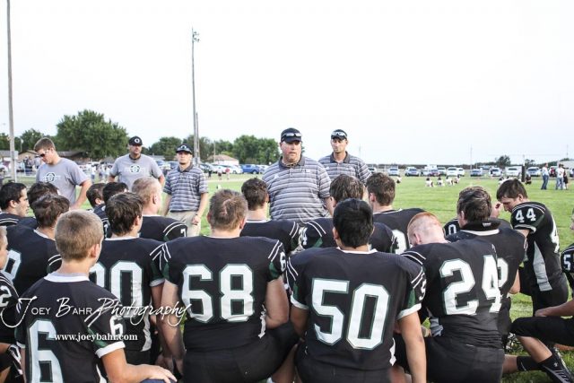 Central Plains Oiler Head Coach Chris Steiner talks to his players following the game. The Victoria Knights defeated the Central Plains Oilers by a score of 34 to 8 at Central Plains High School in Claflin, Kansas on September 2, 2017. (Photo: Joey Bahr, www.joeybahr.com)undefined