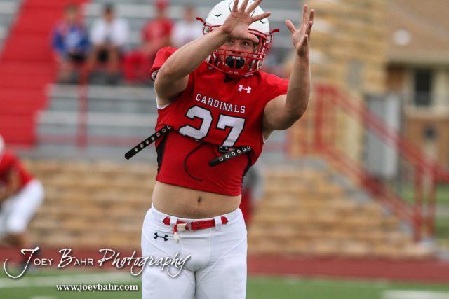 Hoisington Cardinal Hunter Hanzlick (#27) warms up prior to the game. The Hoisington Cardinals defeated the Wichita Collegiate Spartans 31 to 22 at Elton Brown Field in Hoisington, Kansas on September 9, 2016. (Photo: Joey Bahr, www.joeybahr.com)undefined