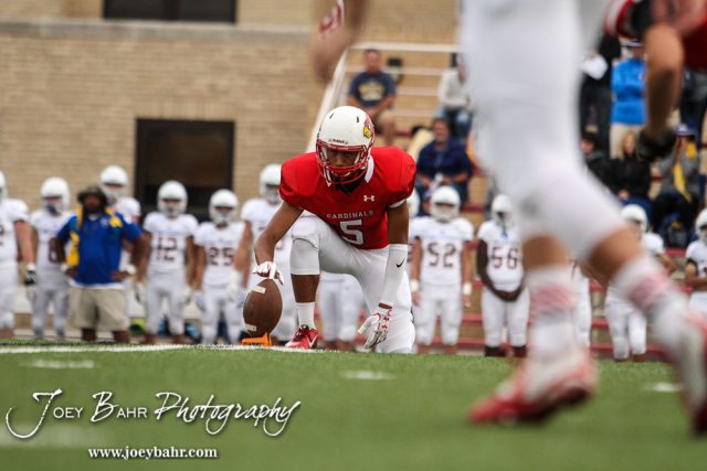 Hoisington Cardinal Cameron Davis (#5) holds the ball for the opening kickoff. The Hoisington Cardinals defeated the Wichita Collegiate Spartans 31 to 22 at Elton Brown Field in Hoisington, Kansas on September 9, 2016. (Photo: Joey Bahr, www.joeybahr.com)undefined