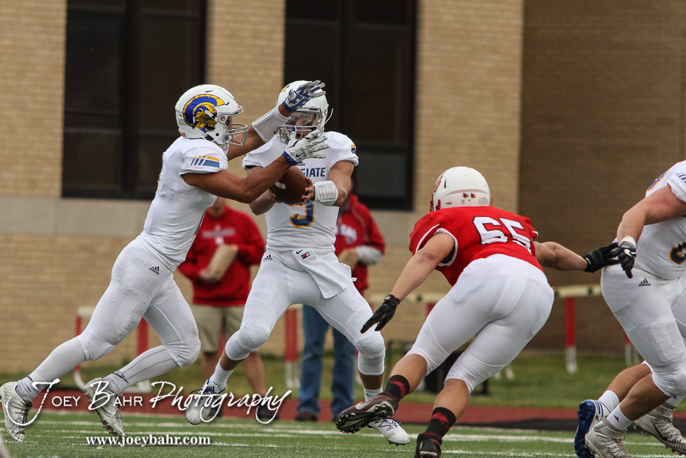 Wichita Collegiate Spartan Cody McNerney (#5) hands the ball off to Juston Flowers (#1) The Hoisington Cardinals defeated the Wichita Collegiate Spartans 31 to 22 at Elton Brown Field in Hoisington, Kansas on September 9, 2016. (Photo: Joey Bahr, www.joeybahr.com)undefined