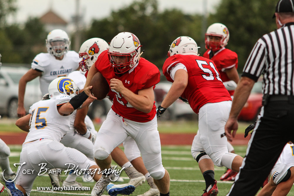 Hoisington Cardinal Hunter Hanzlick (#27) rushes through a whole. The Hoisington Cardinals defeated the Wichita Collegiate Spartans 31 to 22 at Elton Brown Field in Hoisington, Kansas on September 9, 2016. (Photo: Joey Bahr, www.joeybahr.com)undefined