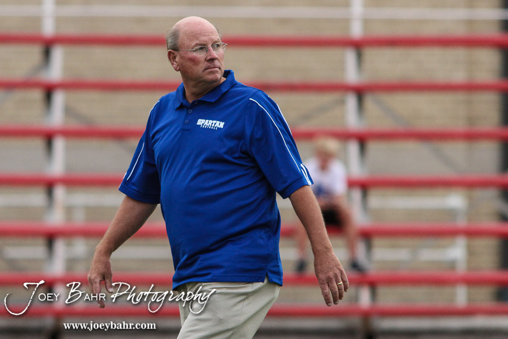 Wichita Collegiate Spartan Head Coach Mike Gehrer watches his team warm up prior to the start of the game. The Hoisington Cardinals defeated the Wichita Collegiate Spartans 31 to 22 at Elton Brown Field in Hoisington, Kansas on September 9, 2016. (Photo: Joey Bahr, www.joeybahr.com)undefined