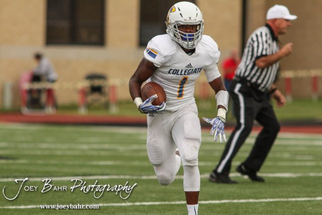 Wichita Collegiate Spartan Juston Flowers (#1) rushes with the ball. The Hoisington Cardinals defeated the Wichita Collegiate Spartans 31 to 22 at Elton Brown Field in Hoisington, Kansas on September 9, 2016. (Photo: Joey Bahr, www.joeybahr.com)undefined
