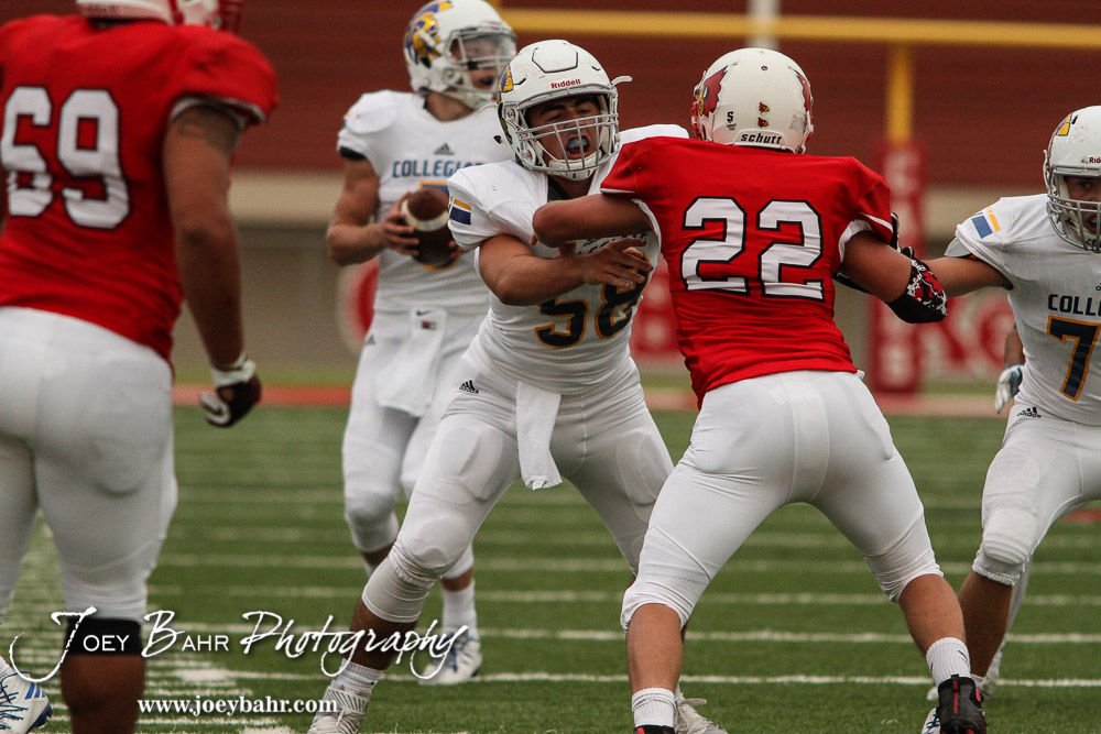Hoisington Cardinal Jared Curtis (#22) tangles with Wichita Collegiate Spartan Jack Bendell (#58) on the line of scrimmage. The Hoisington Cardinals defeated the Wichita Collegiate Spartans 31 to 22 at Elton Brown Field in Hoisington, Kansas on September 9, 2016. (Photo: Joey Bahr, www.joeybahr.com)undefined