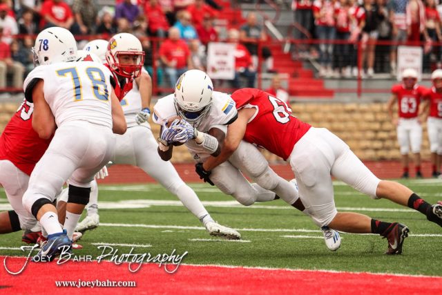 Wichita Collegiate Spartan Juston Flowers (#1) scores a touchdown as Hoisington Cardinal Ben Schneider (#65) tries to tackle him. The Hoisington Cardinals defeated the Wichita Collegiate Spartans 31 to 22 at Elton Brown Field in Hoisington, Kansas on September 9, 2016. (Photo: Joey Bahr, www.joeybahr.com)undefined