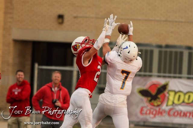 Hoisington Cardinal Rudy Gearhart (#21) breaks up a pass to Wichita Collegiate Spartan Peter Larsen (#7). The Hoisington Cardinals defeated the Wichita Collegiate Spartans 31 to 22 at Elton Brown Field in Hoisington, Kansas on September 9, 2016. (Photo: Joey Bahr, www.joeybahr.com)undefined