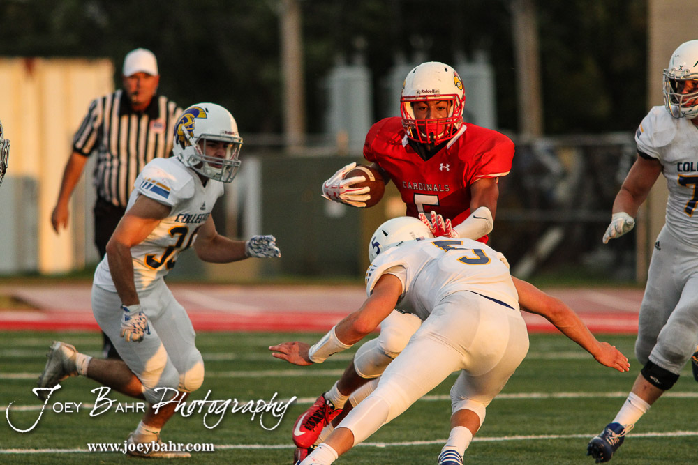 Wichita Collegiate Spartan Cody McNerney (#5) breaks down to tackle Hoisington Cardinal Cameron Davis (#5). The Hoisington Cardinals defeated the Wichita Collegiate Spartans 31 to 22 at Elton Brown Field in Hoisington, Kansas on September 9, 2016. (Photo: Joey Bahr, www.joeybahr.com)undefined