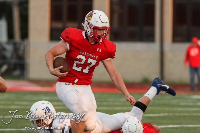 Hoisington Cardinal Hunter Hanzlick (#27) carries the ball. The Hoisington Cardinals defeated the Wichita Collegiate Spartans 31 to 22 at Elton Brown Field in Hoisington, Kansas on September 9, 2016. (Photo: Joey Bahr, www.joeybahr.com)undefined