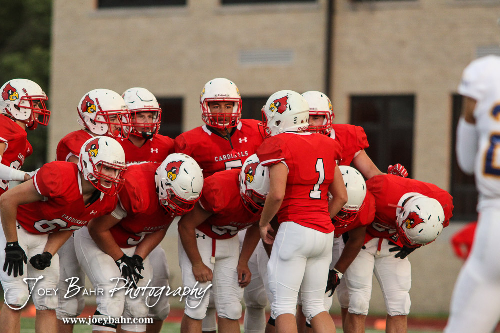 The players in the huddle listen to the next play from Hoisington Cardinal Tyler Specht (#1) The Hoisington Cardinals defeated the Wichita Collegiate Spartans 31 to 22 at Elton Brown Field in Hoisington, Kansas on September 9, 2016. (Photo: Joey Bahr, www.joeybahr.com)undefined