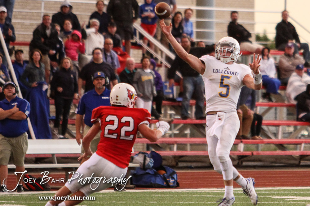 Wichita Collegiate Spartan Cody McNerney (#5) throws a pass as Hoisington Cardinal Jared Curtis (#22) cuts towards him. The Hoisington Cardinals defeated the Wichita Collegiate Spartans 31 to 22 at Elton Brown Field in Hoisington, Kansas on September 9, 2016. (Photo: Joey Bahr, www.joeybahr.com)undefined