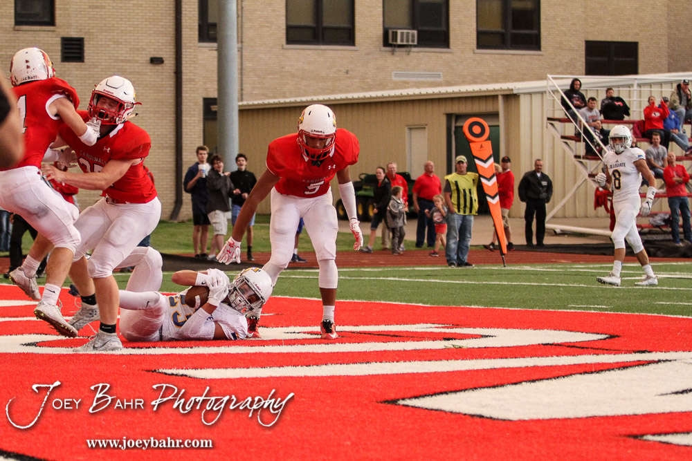 Wichita Collegiate Spartan Jad Hourani (#23) catches a touchdown pass in the end zone. The Hoisington Cardinals defeated the Wichita Collegiate Spartans 31 to 22 at Elton Brown Field in Hoisington, Kansas on September 9, 2016. (Photo: Joey Bahr, www.joeybahr.com)undefined