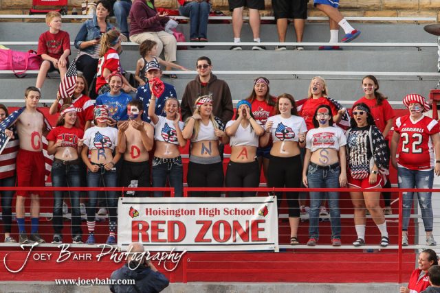 Hoisington students cheer on their team prior to the game. The Hoisington Cardinals defeated the Wichita Collegiate Spartans 31 to 22 at Elton Brown Field in Hoisington, Kansas on September 9, 2016. (Photo: Joey Bahr, www.joeybahr.com)undefined