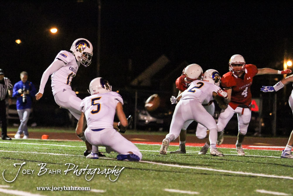 Wichita Collegiate Spartan Addison Harris (#13) kicks a Point After Touchdown as Cody McNerney (#5) holds. The Hoisington Cardinals defeated the Wichita Collegiate Spartans 31 to 22 at Elton Brown Field in Hoisington, Kansas on September 9, 2016. (Photo: Joey Bahr, www.joeybahr.com)undefined