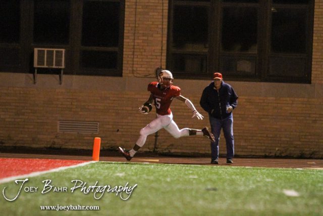 Hoisington Cardinal Cameron Davis (#5) runs to the end zone to score a touchdown. The Hoisington Cardinals defeated the Wichita Collegiate Spartans 31 to 22 at Elton Brown Field in Hoisington, Kansas on September 9, 2016. (Photo: Joey Bahr, www.joeybahr.com)undefined