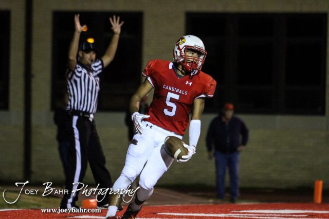 Hoisington Cardinal Cameron Davis (#5) scores a two point conversion. The Hoisington Cardinals defeated the Wichita Collegiate Spartans 31 to 22 at Elton Brown Field in Hoisington, Kansas on September 9, 2016. (Photo: Joey Bahr, www.joeybahr.com)undefined