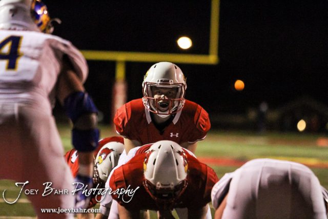 Hoisington Cardinal Tyler Specht (#1) calls out the cadence. The Hoisington Cardinals defeated the Wichita Collegiate Spartans 31 to 22 at Elton Brown Field in Hoisington, Kansas on September 9, 2016. (Photo: Joey Bahr, www.joeybahr.com)undefined