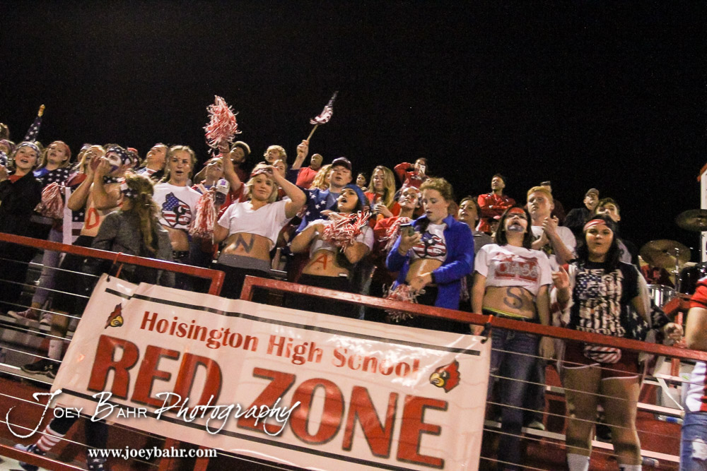 Students from Hoisington High School cheer on their team. The Hoisington Cardinals defeated the Wichita Collegiate Spartans 31 to 22 at Elton Brown Field in Hoisington, Kansas on September 9, 2016. (Photo: Joey Bahr, www.joeybahr.com)undefined