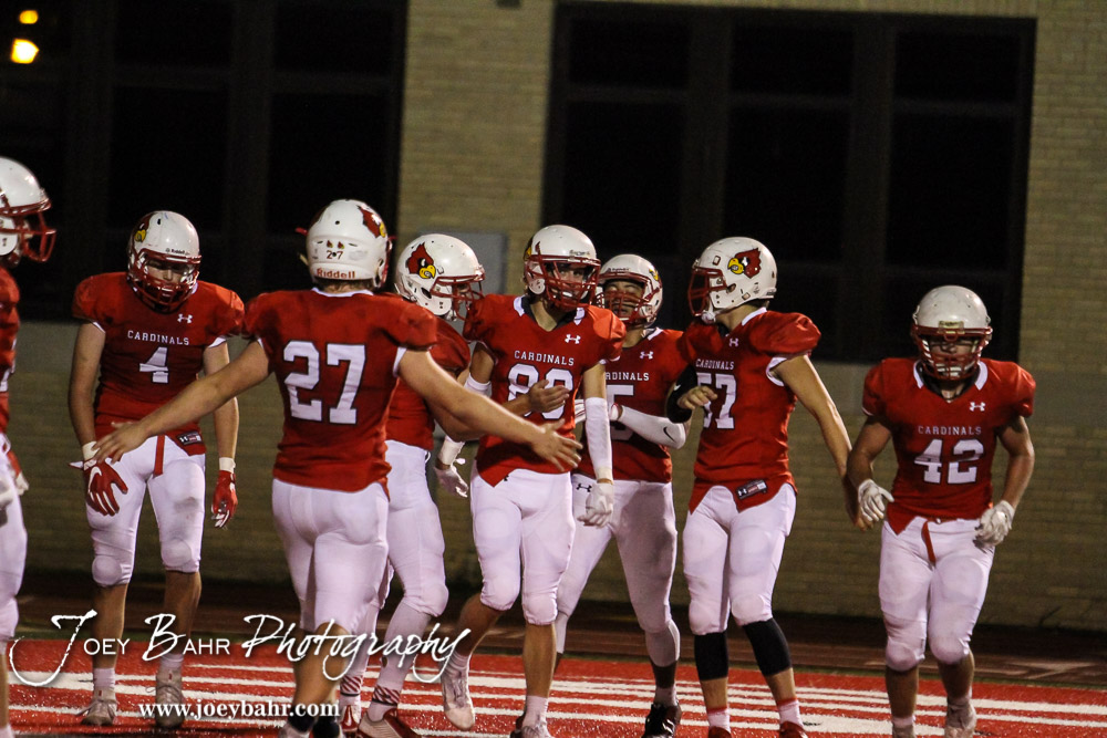 Teammates congratulate Hoisington Cardinal Brenner Donovan (#80) on catching the game clinching interception. The Hoisington Cardinals defeated the Wichita Collegiate Spartans 31 to 22 at Elton Brown Field in Hoisington, Kansas on September 9, 2016. (Photo: Joey Bahr, www.joeybahr.com)undefined