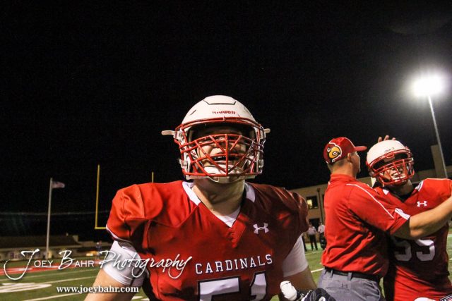 Hoisington Cardinal Landen Urban (#51) celebrates the win. The Hoisington Cardinals defeated the Wichita Collegiate Spartans 31 to 22 at Elton Brown Field in Hoisington, Kansas on September 9, 2016. (Photo: Joey Bahr, www.joeybahr.com)undefined