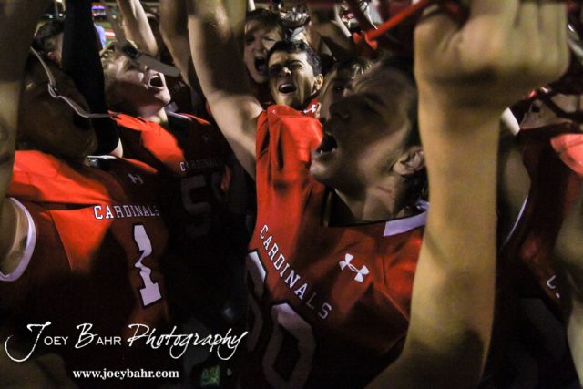Hoisington Cardinal Jeremy Breit (#60) leads the team in a chant following the game. The Hoisington Cardinals defeated the Wichita Collegiate Spartans 31 to 22 at Elton Brown Field in Hoisington, Kansas on September 9, 2016. (Photo: Joey Bahr, www.joeybahr.com)undefined