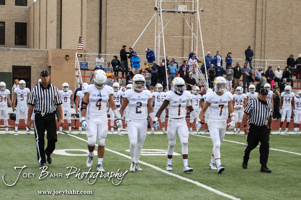 The Wichita Collegiate Spartan Captains walk out to the middle of the field for the coin toss. The Hoisington Cardinals defeated the Wichita Collegiate Spartans 31 to 22 at Elton Brown Field in Hoisington, Kansas on September 9, 2016. (Photo: Joey Bahr, www.joeybahr.com)undefined