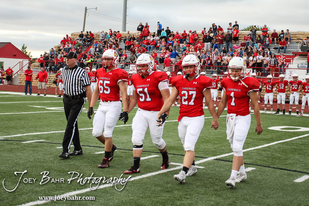 The Hoisington Cardinal Team Captains walk out to the middle of the field for the coin toss. The Hoisington Cardinals defeated the Wichita Collegiate Spartans 31 to 22 at Elton Brown Field in Hoisington, Kansas on September 9, 2016. (Photo: Joey Bahr, www.joeybahr.com)undefined