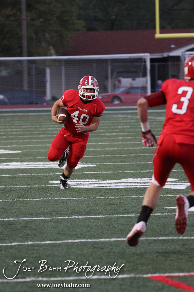 McPherson Bullpup Dalton Clark (#40) rushes down the field during the Winfield at McPherson football game that ended in a 47 to 8 victory for the Bullpups at the McPherson Stadium in McPherson, Kansas on September 28, 2012. (Photo: Joey Bahr, www.joeybahr.com)