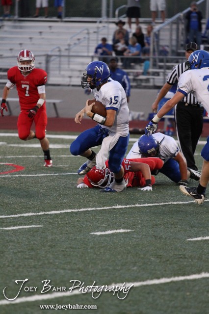 Winfield Vikings Quarterback Sam Camp (#15) evades the tackle of a McPherson Bullpup during the Winfield at McPherson football game that ended in a 47 to 8 victory for the Bullpups at the McPherson Stadium in McPherson, Kansas on September 28, 2012. (Photo: Joey Bahr, www.joeybahr.com)