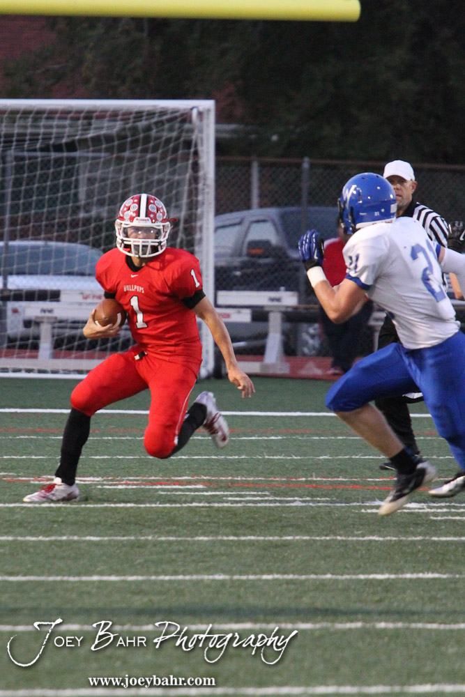McPherson Bullpup Marcus Houghton (#1) rushes with the football during the Winfield at McPherson football game that ended in a 47 to 8 victory for the Bullpups at the McPherson Stadium in McPherson, Kansas on September 28, 2012. (Photo: Joey Bahr, www.joeybahr.com)