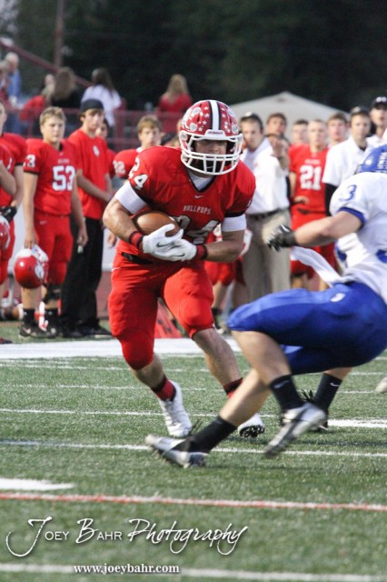 McPherson Bullpup Austin Obannon (#24) carries the football during the Winfield at McPherson football game that ended in a 47 to 8 victory for the Bullpups at the McPherson Stadium in McPherson, Kansas on September 28, 2012. (Photo: Joey Bahr, www.joeybahr.com)