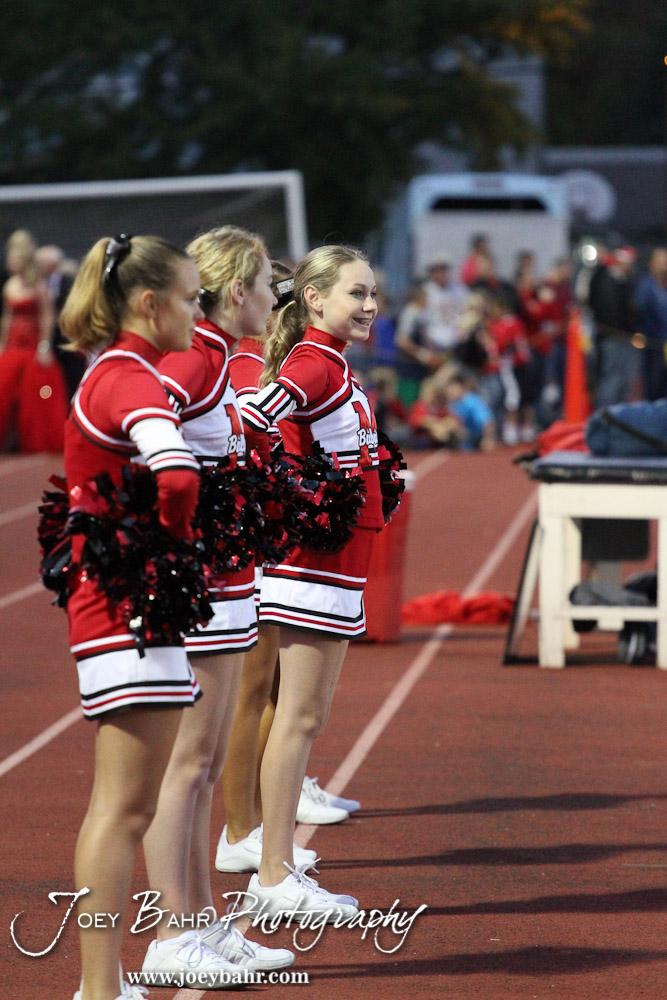 The McPherson Bullpups Cheerleaders watch the game during the Winfield at McPherson football game that ended in a 47 to 8 victory for the Bullpups at the McPherson Stadium in McPherson, Kansas on September 28, 2012. (Photo: Joey Bahr, www.joeybahr.com)