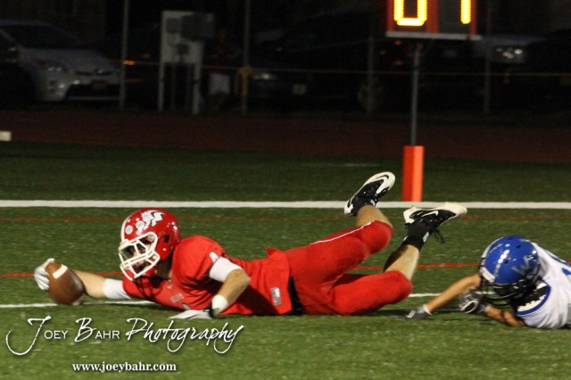 McPherson Bullpup Keaton Sorenson (#4) stretches out for a touchdown during the Winfield at McPherson football game that ended in a 47 to 8 victory for the Bullpups at the McPherson Stadium in McPherson, Kansas on September 28, 2012. (Photo: Joey Bahr, www.joeybahr.com)