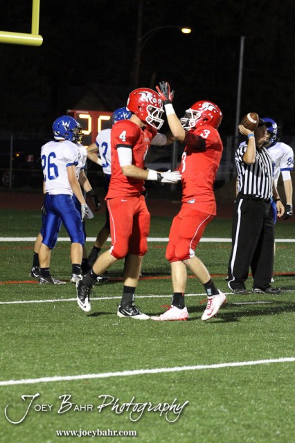 McPherson Bullpup Alex Bahr (#3) celebrates a score with Keaton Sorenson (#4) during the Winfield at McPherson football game that ended in a 47 to 8 victory for the Bullpups at the McPherson Stadium in McPherson, Kansas on September 28, 2012. (Photo: Joey Bahr, www.joeybahr.com)