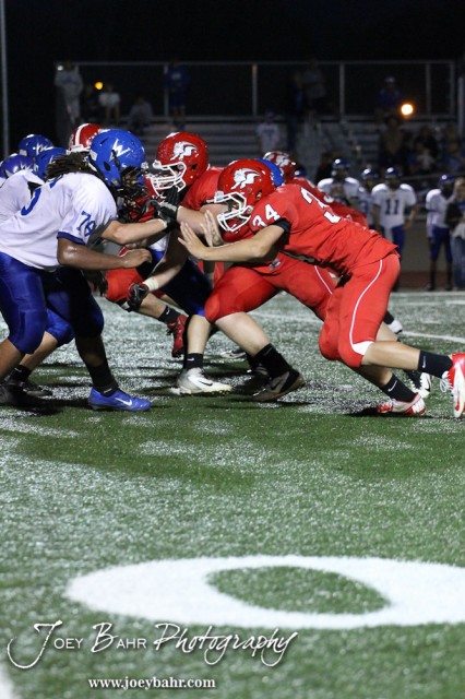 The McPherson Bullpups defensive line launches into the Winfield Vikings line during the Winfield at McPherson football game that ended in a 47 to 8 victory for the Bullpups at the McPherson Stadium in McPherson, Kansas on September 28, 2012. (Photo: Joey Bahr, www.joeybahr.com)