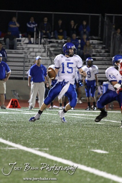 Winfield Vikings Sam Camp (#15) looks for a receiver to pass to during the Winfield at McPherson football game that ended in a 47 to 8 victory for the Bullpups at the McPherson Stadium in McPherson, Kansas on September 28, 2012. (Photo: Joey Bahr, www.joeybahr.com)