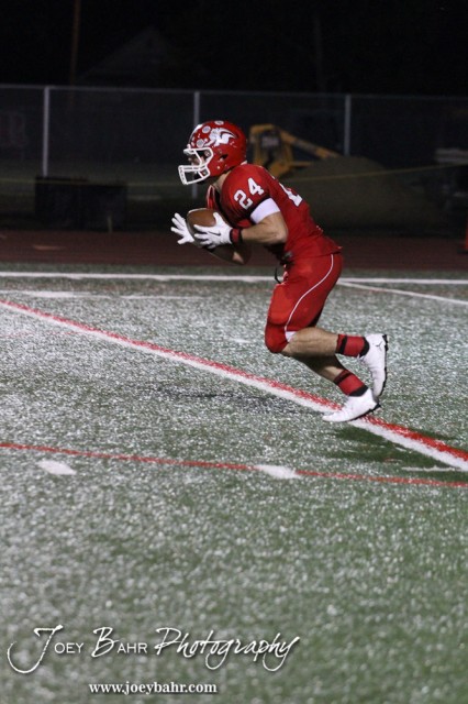 McPherson Bullpup Austin Obannon (#24) catches the Second Half Kickoff during the Winfield at McPherson football game that ended in a 47 to 8 victory for the Bullpups at the McPherson Stadium in McPherson, Kansas on September 28, 2012. (Photo: Joey Bahr, www.joeybahr.com)