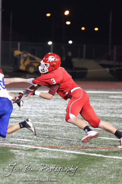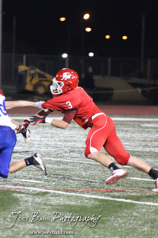 McPherson Bullpups Alex Bahr (#3) gets pulled by a Winfield Vikings defender during the Winfield at McPherson football game that ended in a 47 to 8 victory for the Bullpups at the McPherson Stadium in McPherson, Kansas on September 28, 2012. (Photo: Joey Bahr, www.joeybahr.com)