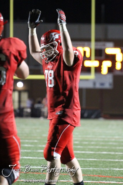 McPherson Bullpup Garrett Larson (#78) celebrates a touchdown during the Winfield at McPherson football game that ended in a 47 to 8 victory for the Bullpups at the McPherson Stadium in McPherson, Kansas on September 28, 2012. (Photo: Joey Bahr, www.joeybahr.com)
