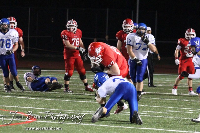 Winfield Viking Kendyl Gard (#3) tries to tackle McPherson Bullpup James Mowery (#87) during the Winfield at McPherson football game that ended in a 47 to 8 victory for the Bullpups at the McPherson Stadium in McPherson, Kansas on September 28, 2012. (Photo: Joey Bahr, www.joeybahr.com)