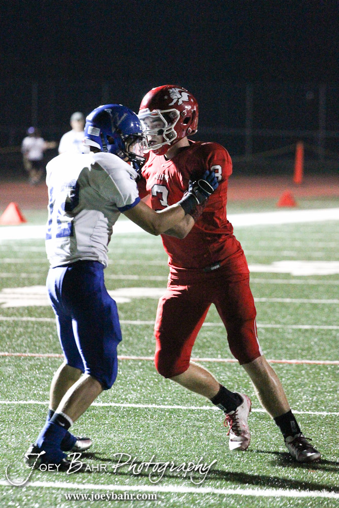 McPherson Bullpup Alex Bahr (#3) and Winfield Viking Ryan Minton (#12) tie up during the Winfield at McPherson football game that ended in a 47 to 8 victory for the Bullpups at the McPherson Stadium in McPherson, Kansas on September 28, 2012. (Photo: Joey Bahr, www.joeybahr.com)