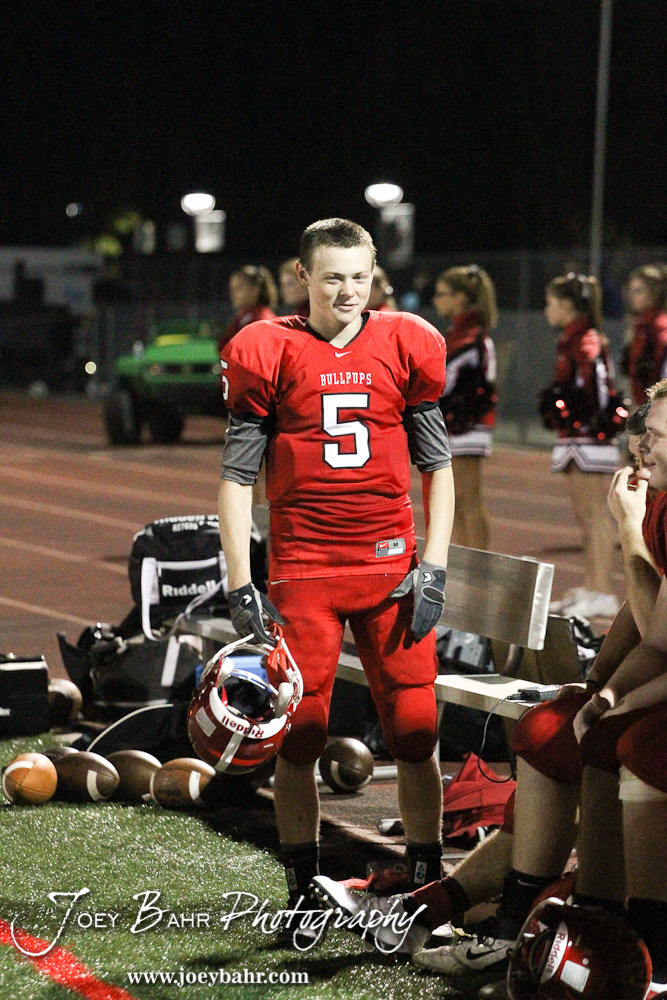 McPherson Bullpup Kyler Kinnamon (#5) relaxes on the sideline during the Winfield at McPherson football game that ended in a 47 to 8 victory for the Bullpups at the McPherson Stadium in McPherson, Kansas on September 28, 2012. (Photo: Joey Bahr, www.joeybahr.com)