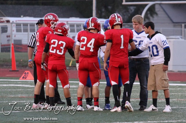Team Captains from the McPherson Bullpups and Winfield Vikings meet before kicking off the Winfield at McPherson football game that ended in a 47 to 8 victory for the Bullpups at the McPherson Stadium in McPherson, Kansas on September 28, 2012. (Photo: Joey Bahr, www.joeybahr.com)