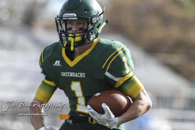 Pratt Greenback Hunter Kaufman (#1) rushes with the ball to the end zone to score a touchdown. The Hayden Wildcats and the Pratt Greenbacks compete in the KSHSAA Class 4A Division II State Championship Game at Salina Stadium in Salina, Kansas on November 26, 2016. (Photo: Joey Bahr, www.joeybahr.com)undefined